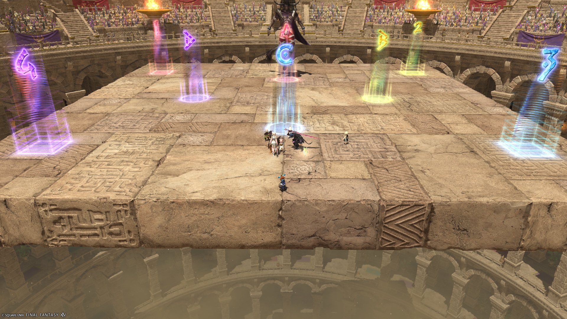 | This particular affects the two ranged DPS that go straight for the second set of knockback towers. While this is understandable (especially early on when trying to learn the mechanic), this keeps them outside AoE healing range from at least one healer. In addition, unlike many mechanics that split the party into two, there is no guarantee that a healer will be on each platform with Majestic Meteor, in which case ranged DPS that go straight for the tower can completely miss all AoE heals. The solution is simple- all players go towards the middle after the first wave, including the range DPS. |