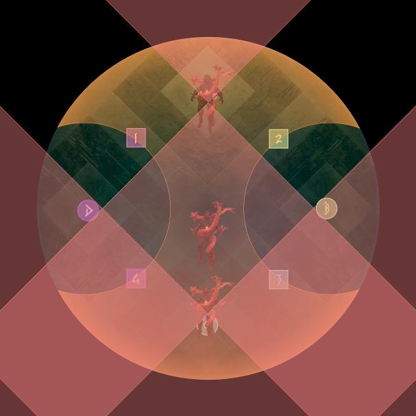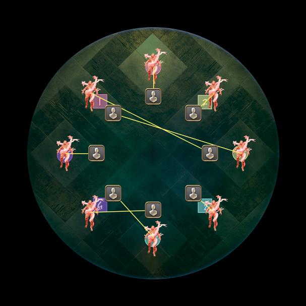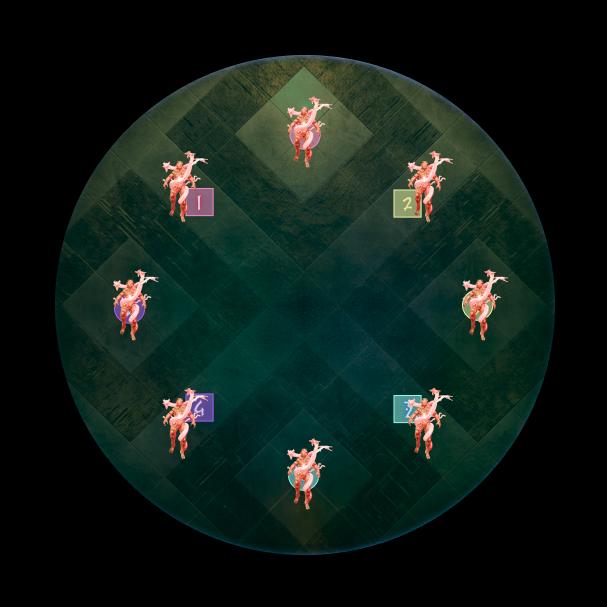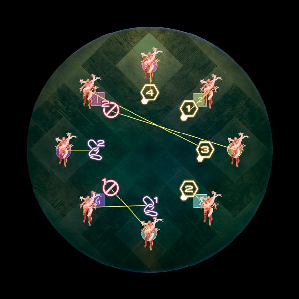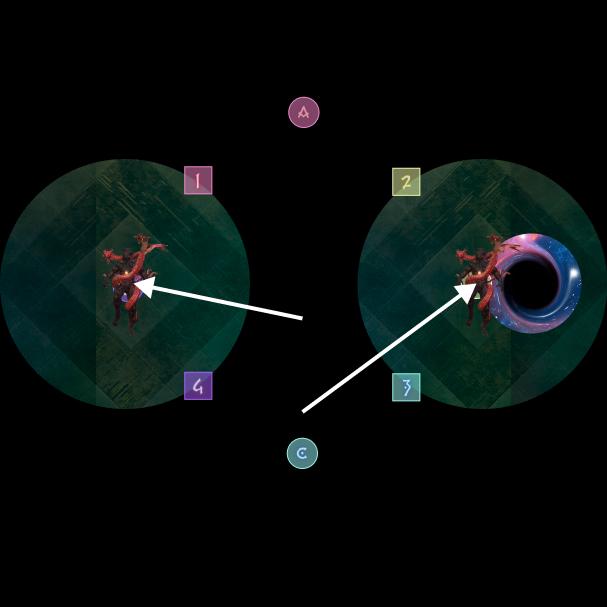 | 18. We return to the full arena, and now resolve the second set of player clone effects set in Step 6. The clones that appeared second in Step 2 will now resolve. This is simply the opposite configuration of Step 16. | |