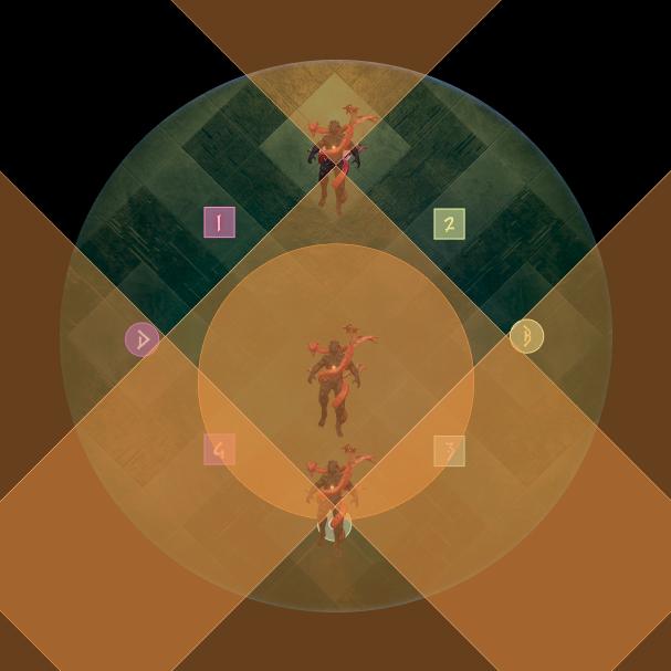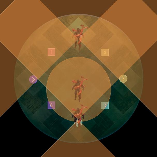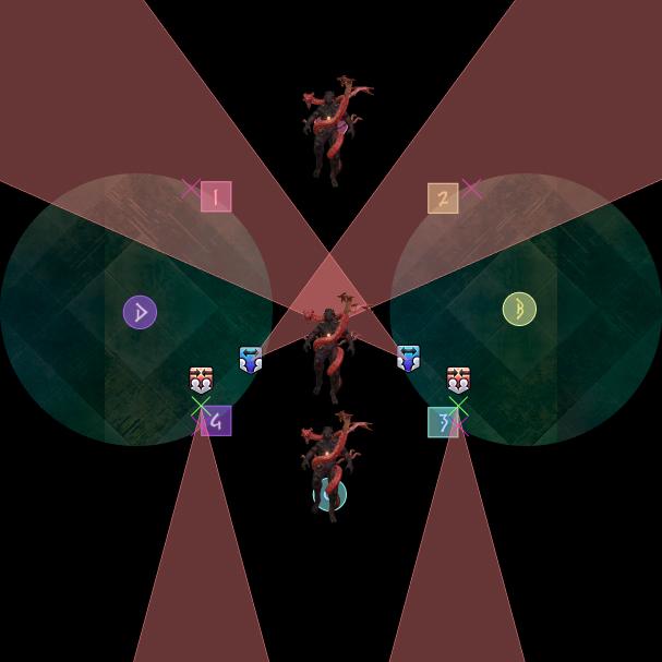 | When the player clones resolve their effects in Step 16 and Step 18 above, they do so in two waves- cardinal vs. intercardinal clones. However, because the base effects assigned in Step 6 alternate between 4-man stacks and Defamations, if we did nothing, then all four 4-man stacks, or all four Defamations would resolve together in Steps 16 and 18, which is impossible to resolve successfully. | |