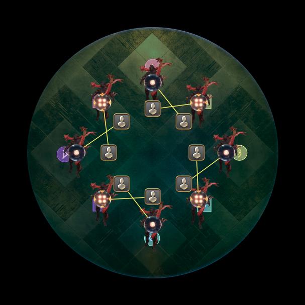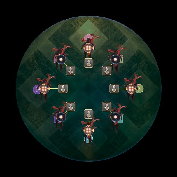 | While the four players at the boundary (N, NE, SW, S) can exchange effects easily, the two pairs of players deep inside their half cannot (W, NW, and E, SE), because if they swapped, there would still be one clone with the opposite effect in that half of the arena. This is why there is a swap between the NW and E players at the start- this lets the now East player (who is assigning their effect to the NW clone) pick between the E and SE effects to give the NW clone the 4-man stack. Likewise, this lets the now NW player (who is assigning their effect to the East clone) to pick between the W and NW effects to give the East clone Defamation. | |