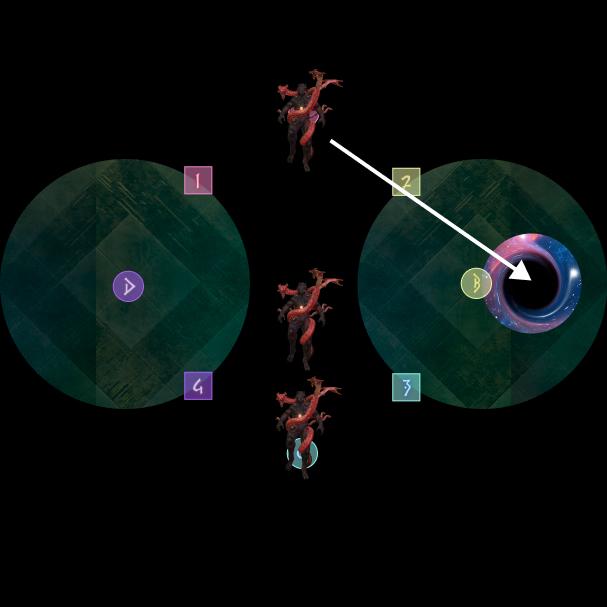 | 16. We return to the full arena, and now resolve the player clone effects set in Step 6. The clones that appeared first in Step 1 will resolve first.