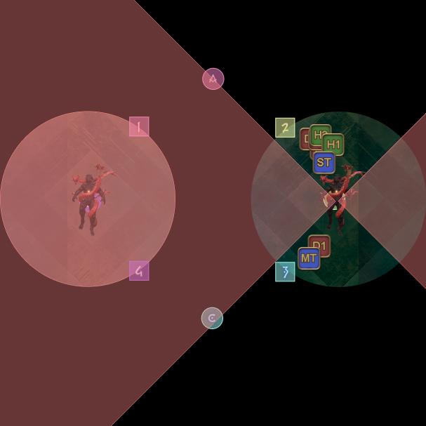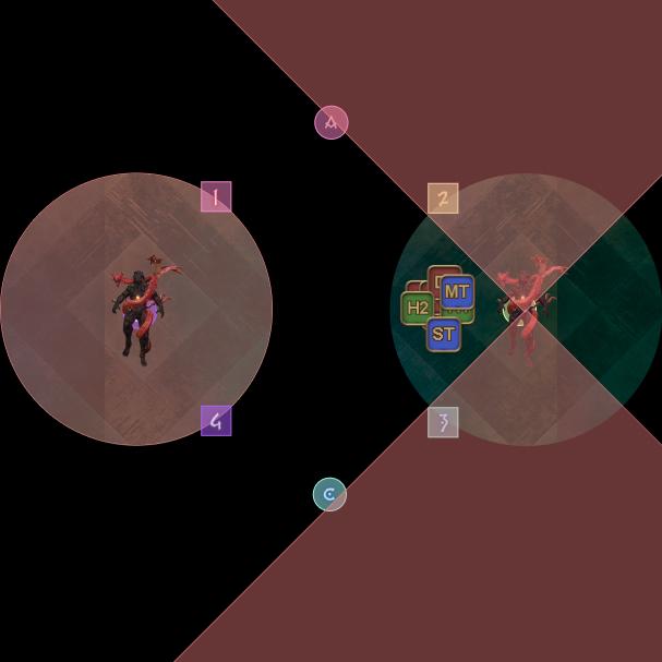 | 7. After the tethers have locked in and cannot be transferred, move to the safe spots (from Step 5) to dodge the clone's cleaves. A telegraph will appear on the ground leaving two islands. | |